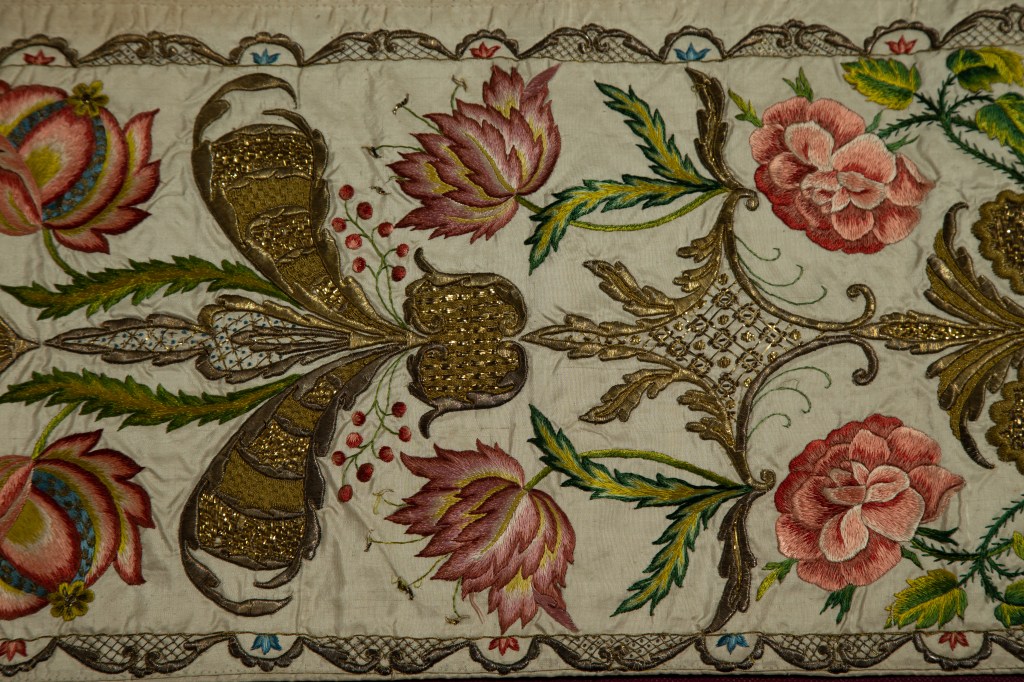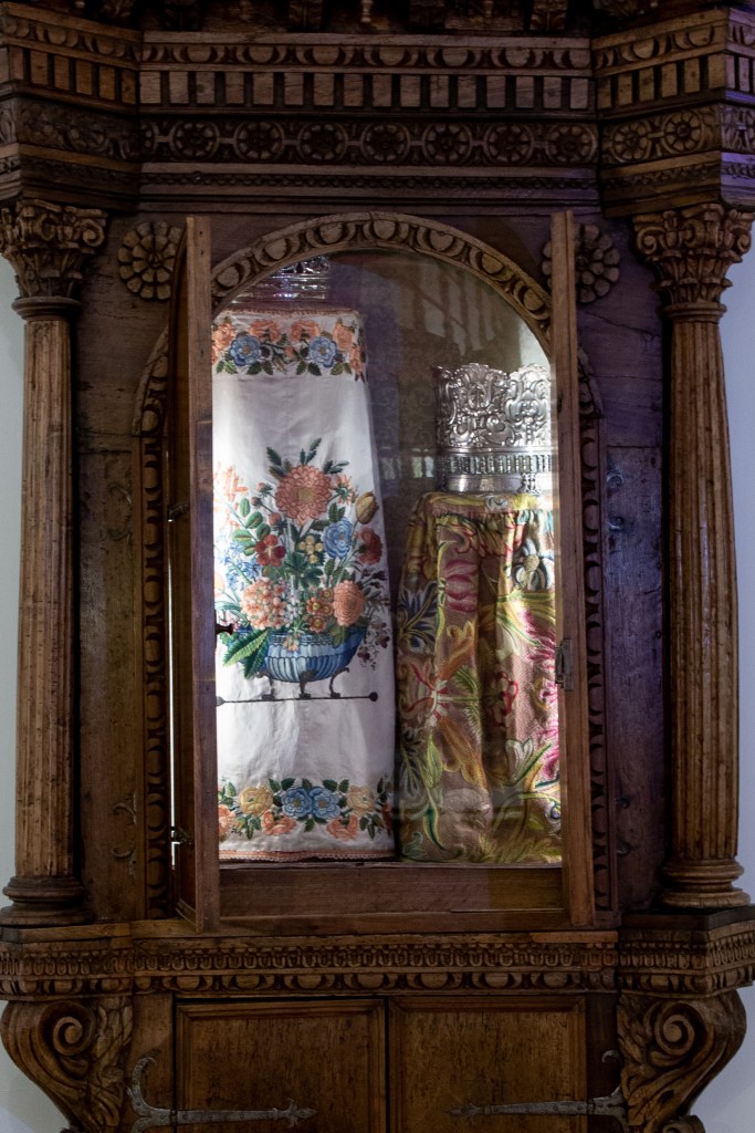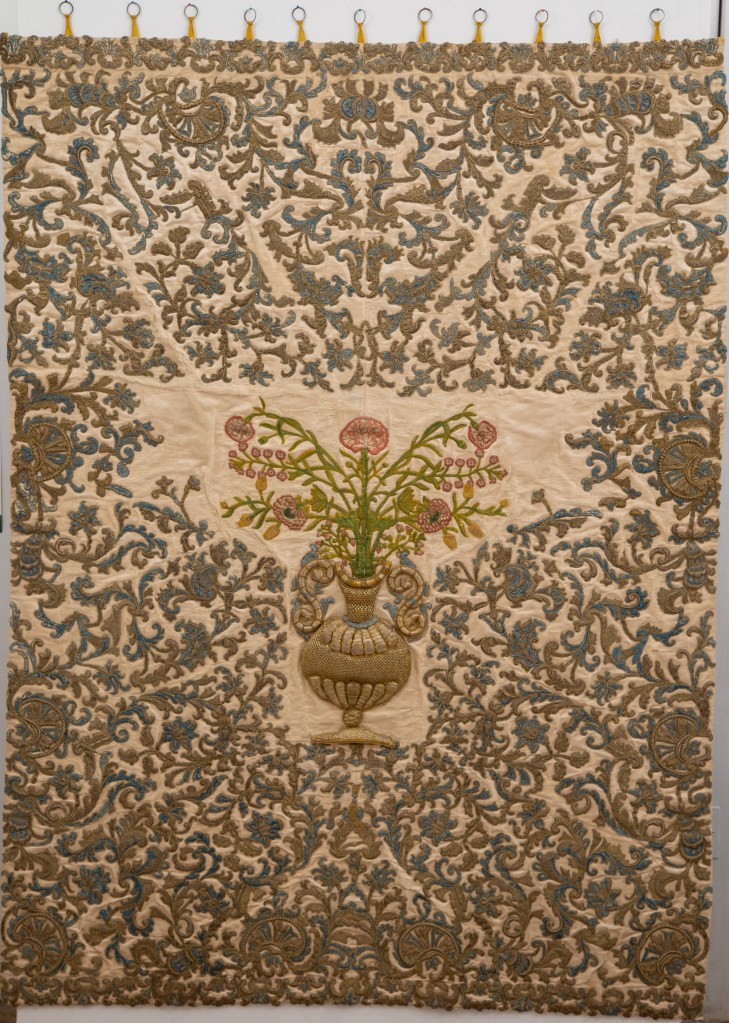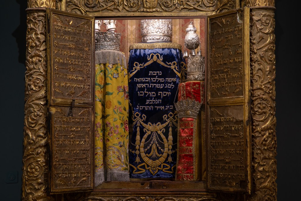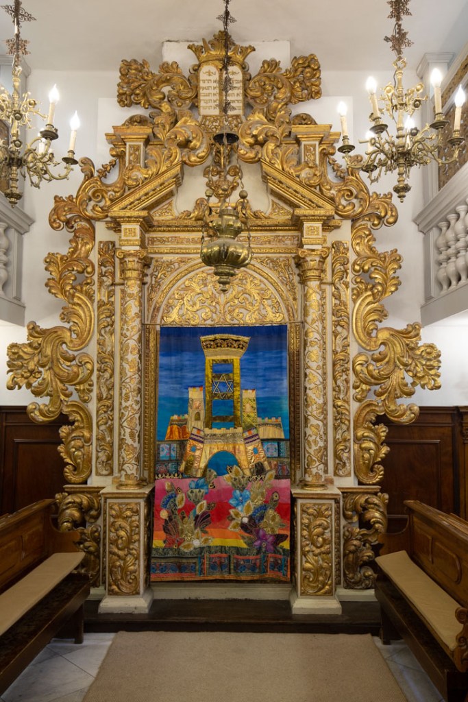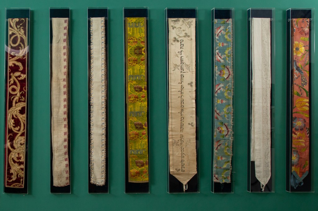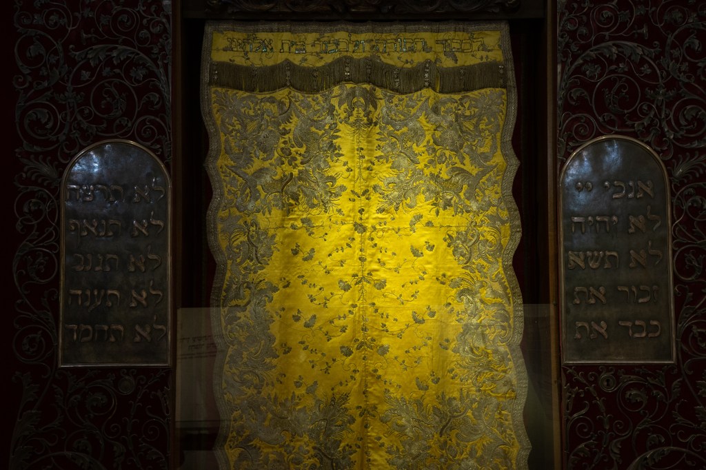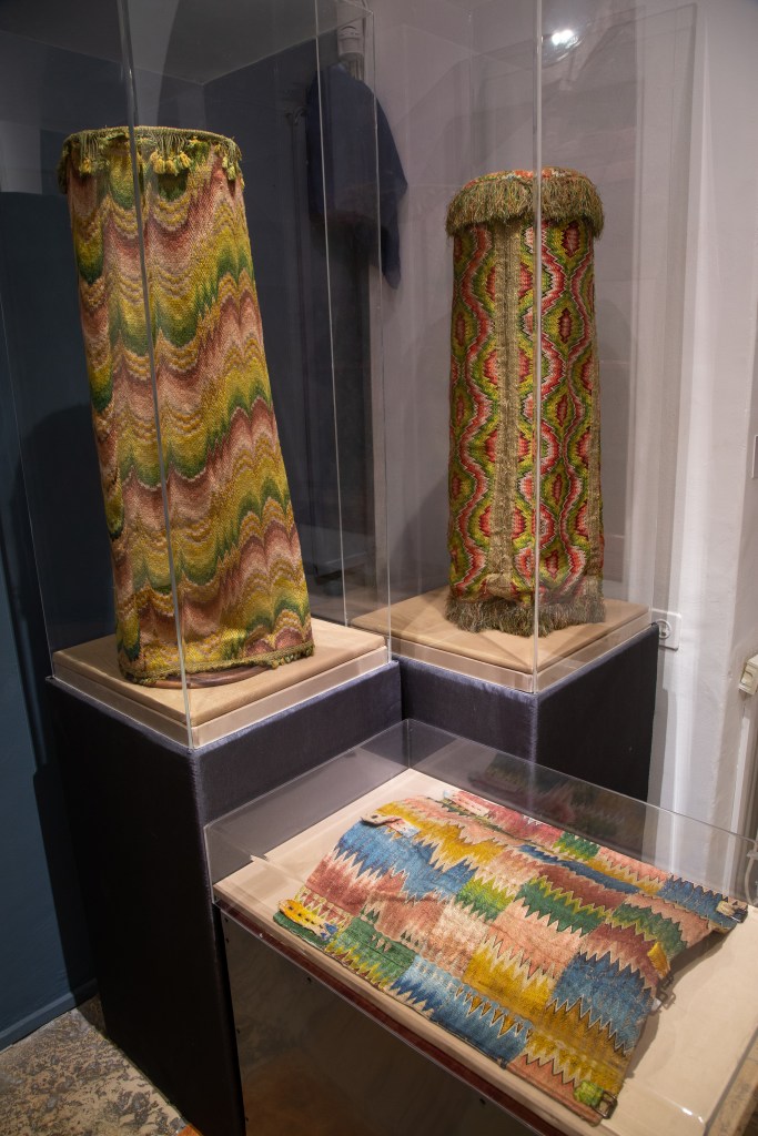 בתערוכה תפגשו פרוכות ייחודיות מהמאה ה-16, כמו פרוכת טדסקי מונציה (בתמונה הגדולה למעלה), תחרות ונציאניות יפות, והינומות כלה וטליתות שרקמה האישה האיטלקיה לארוסה. את עינינו לכדו אסופה של מעילים ייחודים לכיסוי ספרי תורה ובתוכם זוג מעילי ספרי תורה מפירנצה המתוארכים למחצית המאה ה-18, אשר נראים כמו סריגים של בית האופנה Missoni (בתמונה למטה). מסתבר שמשפחת מיסוני לא המציאו דבר, ומדובר ברקמה צבעונית מחוט משי על בדי פשתן ויוטה בתפר להבה (תפר הונגרי הידוע גם כ- Bargello). נגיעה מעניינת נוספת לאופנה היא פרוכת מסוף שנות ה-90 שנוצרה מבגדים של חברת בגדי הים הישראלית גוטקס.