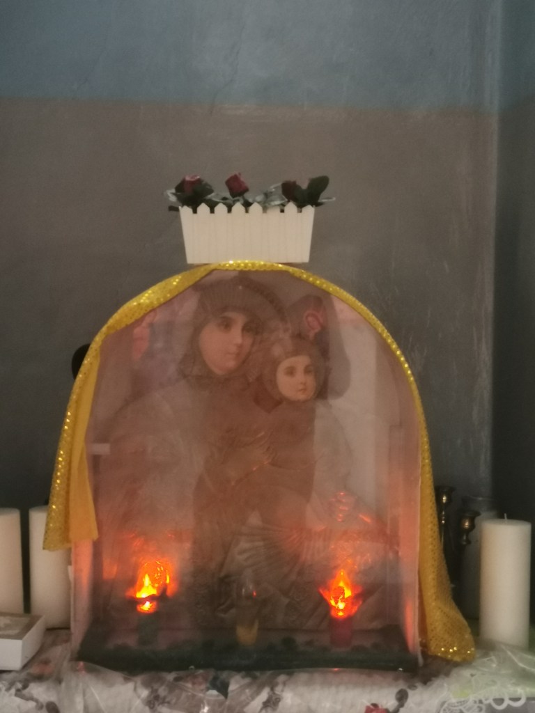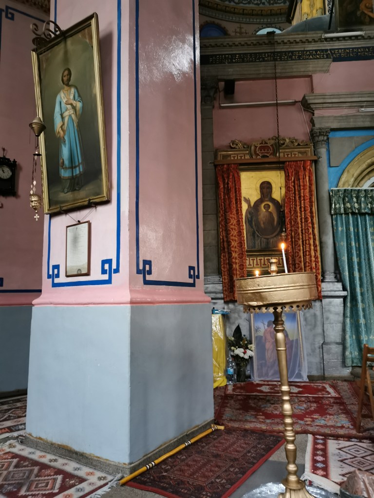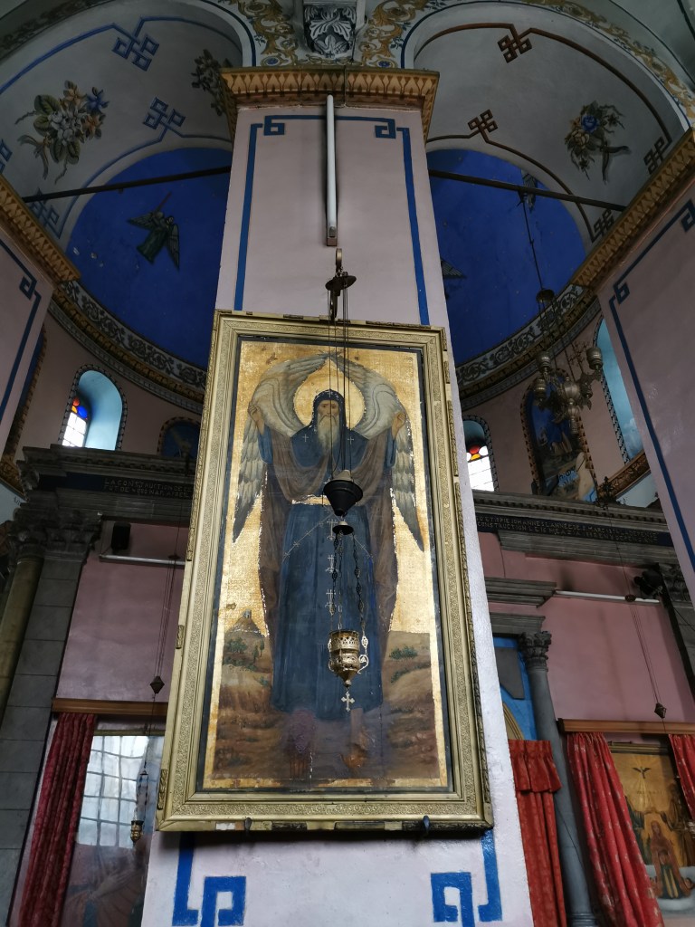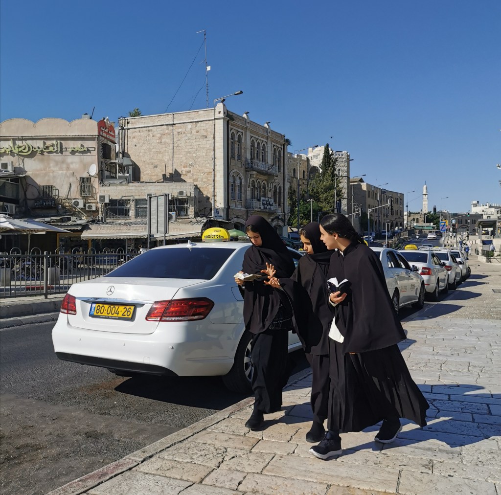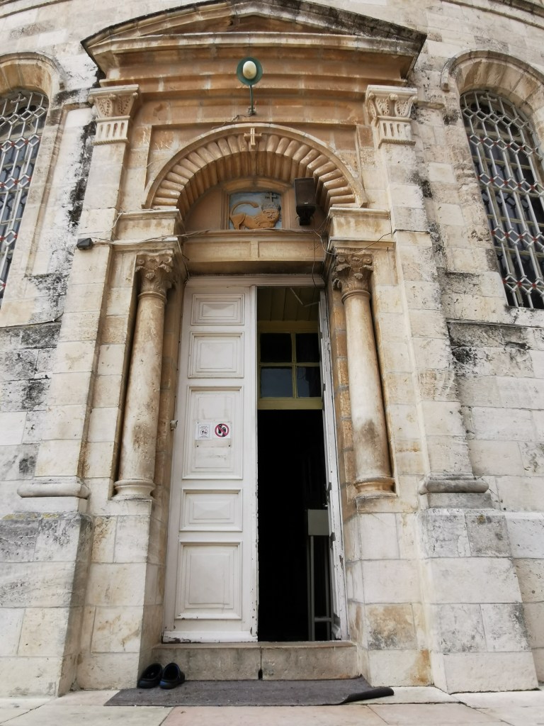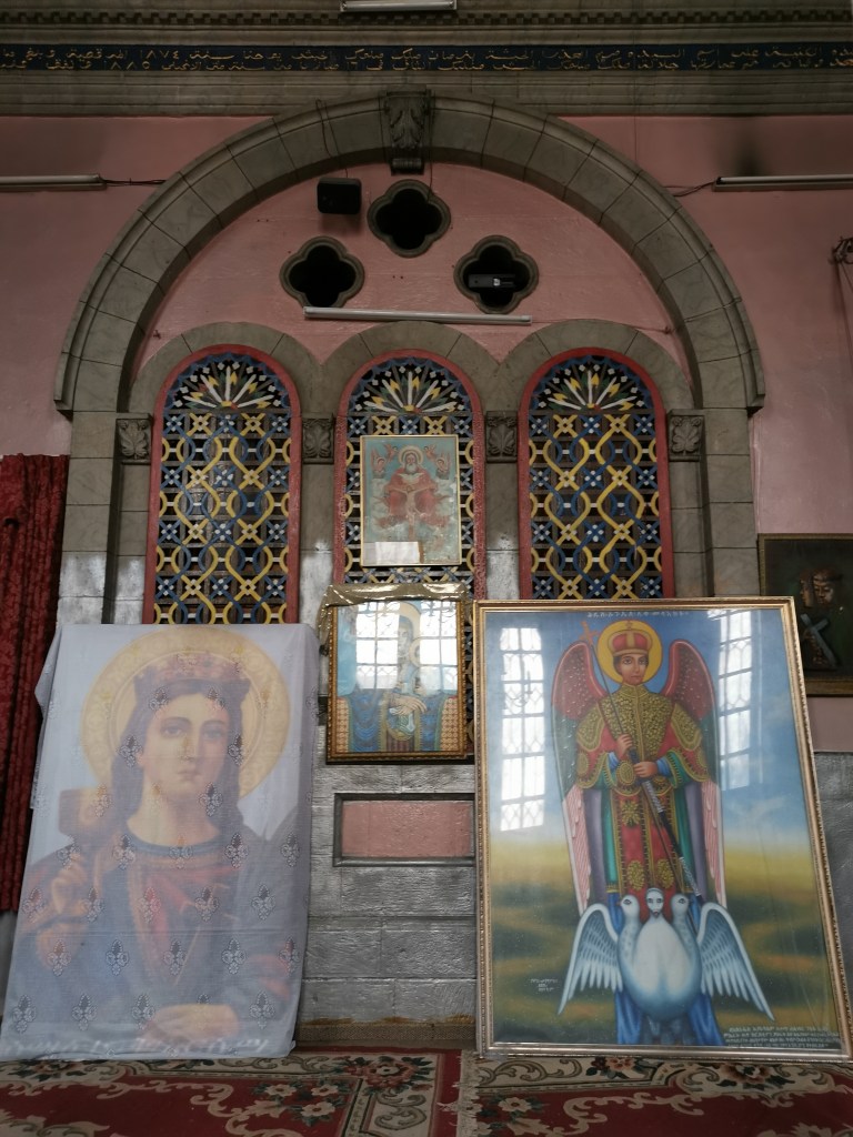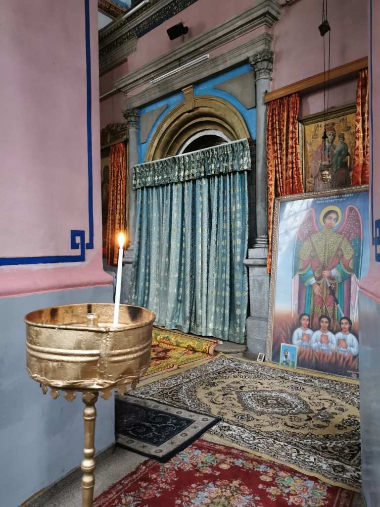 קצת אחרי השעה 14:00 התחלנו לצעוד לעבר אחת הכנסיות היפות בירושלים: כנסיית ״קִידאנה מִהְרַת״ (מאמהרית: ברית הרחמים) המוכרת גם כהכנסיה האתיופית ברחוב אתיופיה במרכז העיר, לא הרחק מהיכן שעוצרות מוניות השירות מ/אל תל אביב. הרחוב היוצא מרחוב הנביאים, מרגיש כמו בריחה לאואזיס מעולם האחר. בניית הכנסיה החלה בשנת 1882 והושלמה לאחר 11 שנה, והיא בנויה על פי דוגמת כנסיות באתיופיה: צורתה עגולה וקודש הקודשים נמצא במבנה נפרד במרכז הכנסייה, כשעל הגג כיפה שחורה שעליה צלב. לי היא הזכירה שילוב בין מסגד לכנסייה, בזכות עיצוב הפנים: שטיחים צבעוניים הפרושים על הרצפה, לצד תמונות של קדושים שחורים התלויים על הקירות, וריח קטורת חזק שמוסיף ניחוח לאווירה המיוחדת.