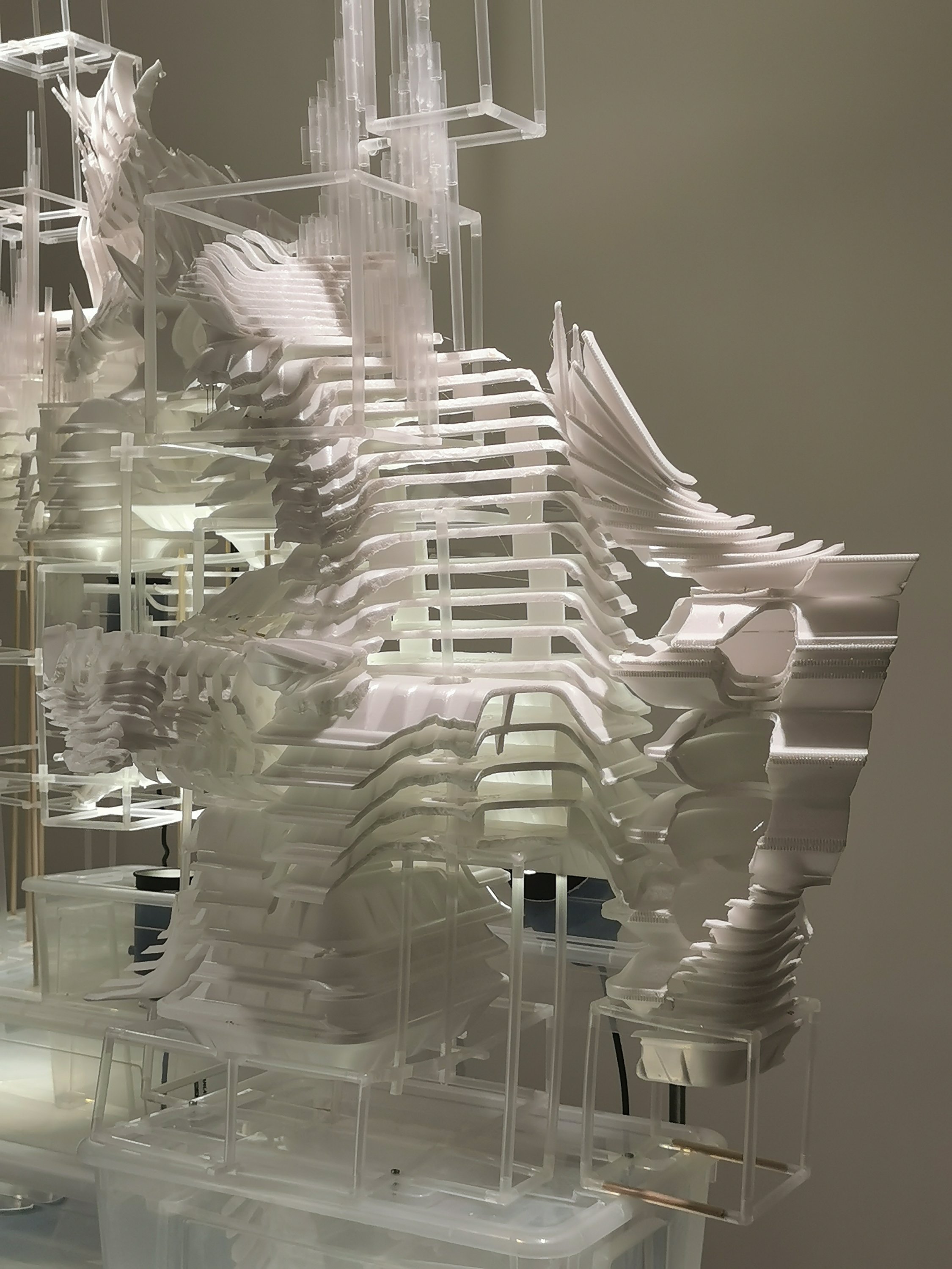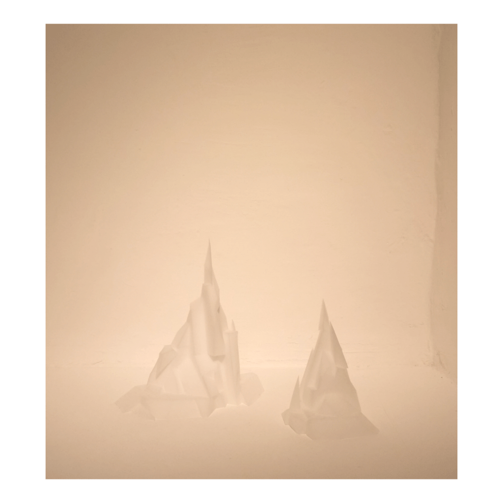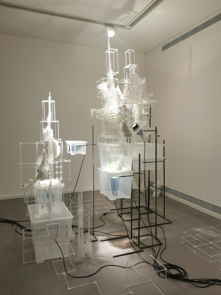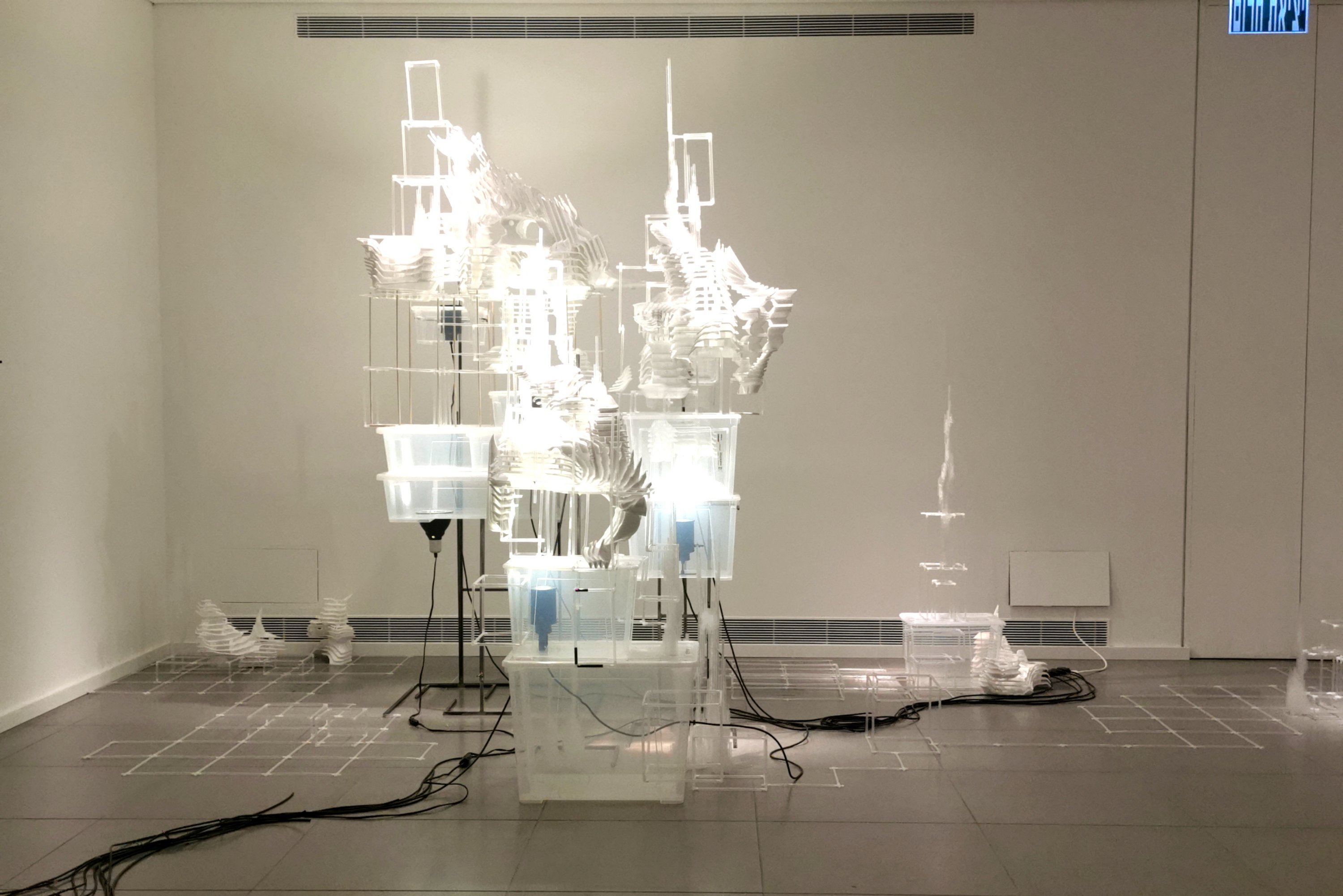 והדמיון פועל מעצמו. כמי שמגדירה את עצמה כחובבת ״מקס סטוק על מלא״, הופמן יצרה את המיצב מחומרי היומיום, כשהם מתכתבים לא רק עם ״עבודות הבית״ אלא גם עם חלל הבית לשימור של אנה טיכו, שמאגף את הצופה בתחושה משולבת של ארעיות ועל-זמניות. קרחוני הספוג הבוהקים שצמחו בפינות הקיר, נראים כמו גידול לבן המתפרץ מתוך הקיר ומשתלט עליו, אך ככל שמתרחקים מהם, נדמים כקצף שעולה מתוך הרצפה ועוצב כטירות דיסני במשחק ילדים. בחלל המרכזי עומד מיצב מקופסאות פלסטיק לבנות עם חוטי חשמל שחורים המתפתלים ממנו על הרצפה, ממנו צומחים מגדלים פריכים שנראים כאילו הונדסו והודפסו במעבדת תלת-מימד, כמעין פארודיה מזרח תיכונית חדשה על בורג׳ חליפה או מאגר לוויתן העומד בלב ים, ותזכורת על כך שהמציאות עלולה להתפרק בכל רגע נתון.