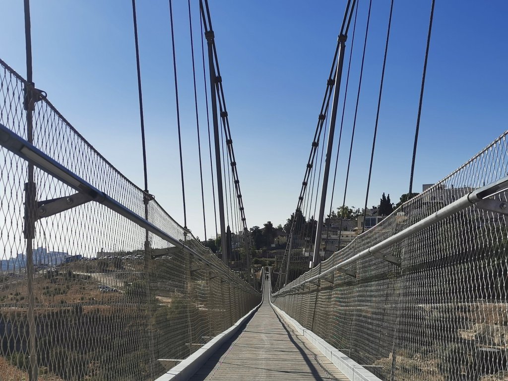 אני הולך הרבה בעיר, קילומטרים ביום, בין אם אלה הליכות למטרות העלאת דופק או הורדת לחץ. במציאות היומיומית של ישראל זה חובה. רגע לאחר שאוגוסט הסתיים והמבקרים בעיר נדדו חזרה לבתיהם, החלטתי לבדוק את הגשר התלוי שנחנך לפני כחודש בין הר ציון לגיא בן הינום, אבל יכול להביא אתכם גם אל שכונת אבו טור היפה והמעורבת. לאורך מאתיים – או שמא עלי לכתוב מאאתיים – ושתיים מטרים צועד המבקר מנקודה א׳ לנקודה ב׳, מבלי להגיע באמת לשומקום. תחנה סופית גיהינום. גיא בן הינום הוא מקור השם גיהינום, המקום שאליו, על פי האמונה, יגיעו החוטאים לאחר המוות.